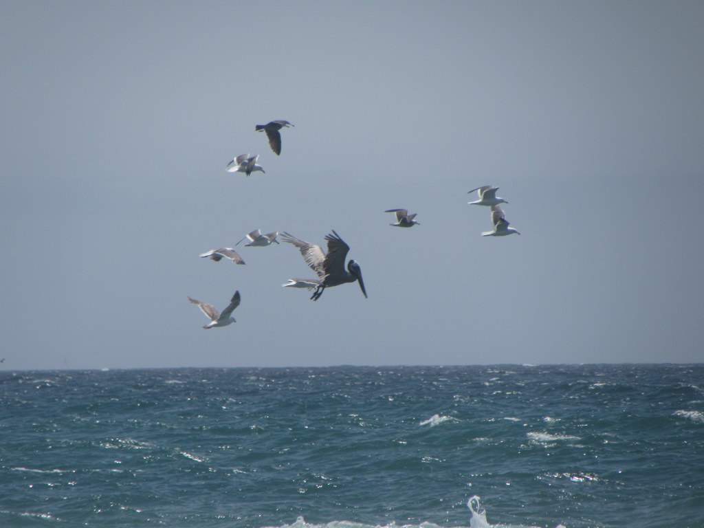 A second flock was floating on the water, watching the show, same as us humans. Perhaps they had already eaten their bellies full and needed the rest. I wondered how the diving pelicans – huge birds, many with a wingspan over 8 feet – didn’t plunge on top of the others as they dove for their food. Even the crash of their enormous bodies into the water did not seem to slow them down. The call of fish had captured them, the captors. It all worked in a plan the pelicans understood, giving an impressive order to the visual chaos that I witnessed.